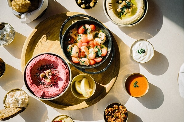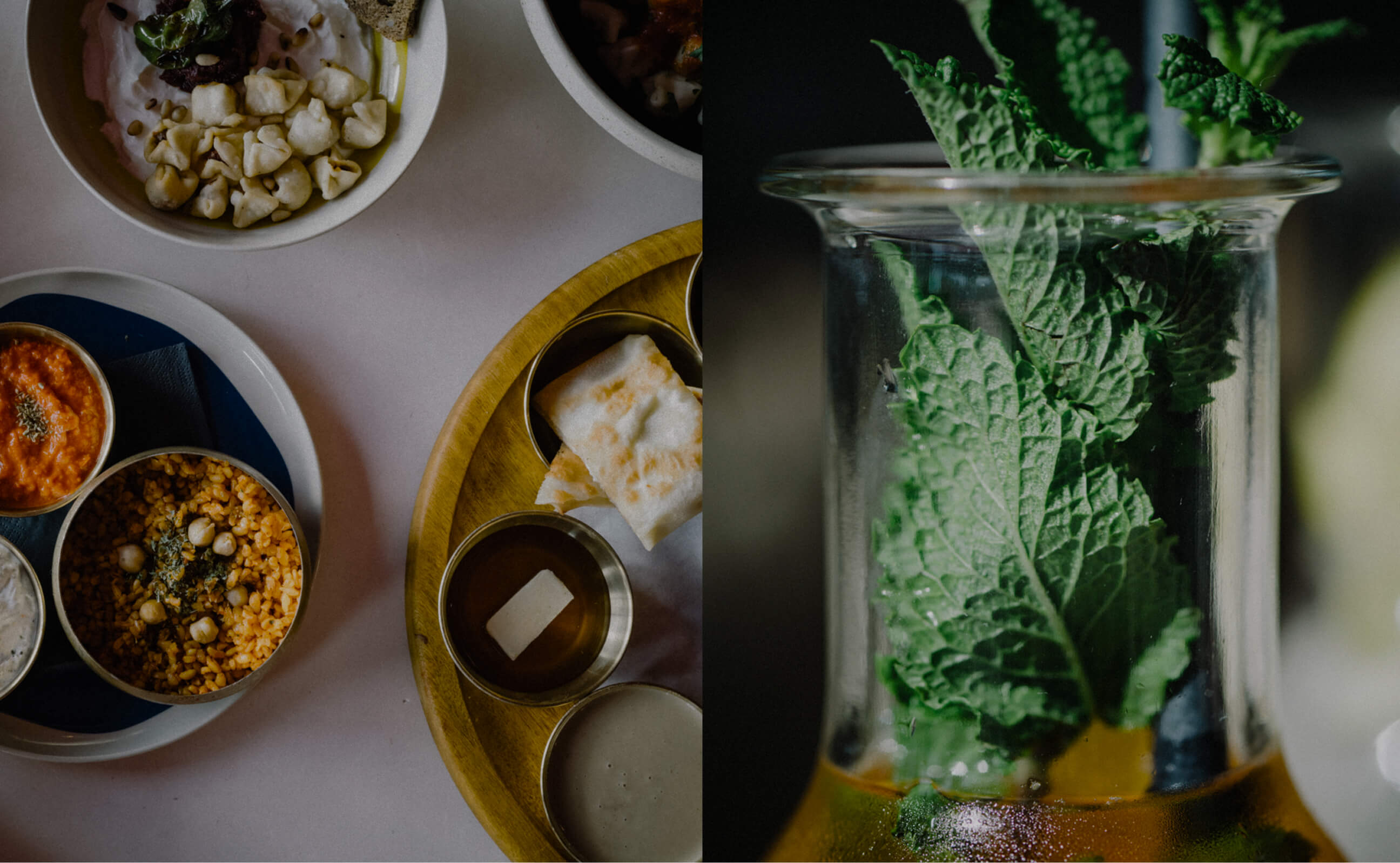 Weißkäse, Tomaten, Oliven, pikanter Frischkäse, Nutella, Butter mit Honig und ein feiner Tahini-Dip.
