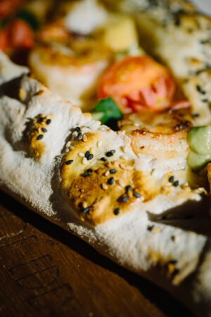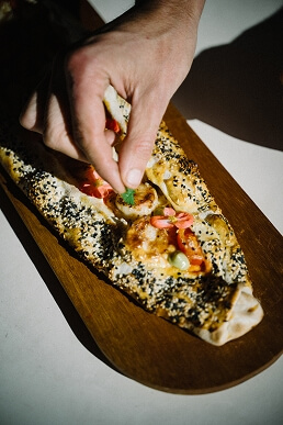 Pide mit geschmolzenem Käse und zwei Bio-Eiern.