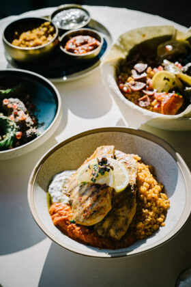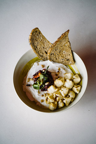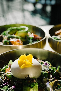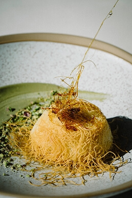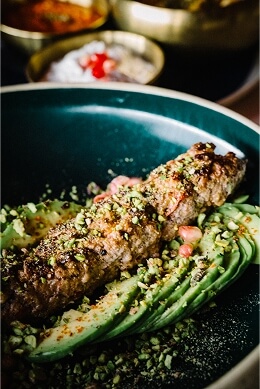 Pochierte Bio-Eier mit Avocado und fein geschnittener, aromatisch gepökelter Pastırma und einer samtigen, orientalisch gewürzten Hollandaise und Harissa.