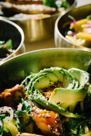 Rührei verfeinert mit Käse und feiner Sumak-Würze, knusprig-frischer türkischer Sesamring, zart gegrillter Lachs in Teriyaki-Sauce, frischer Avocado und Gurke.